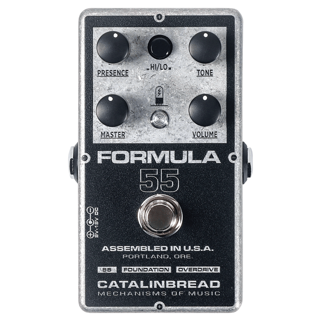 The Formula No. 55 is a Foundation Overdrive that reproduces, in exact detail, the preamp section of the classic Fender™ tweed 5E3 Deluxe using an all-discrete JFET-based signal path. The Volume and Tone controls replicate, part for part, the circuitry of the 5E3, giving you authentic tweed amp response. The output section is designed to give you punch and volume with a low output impedance to drive your amp perfectly. Set the Hi-Lo button to "Lo" for the cleaner response of a vintage tweed. "Hi" is like hot rodding your amp by swapping in higher gain tubes.