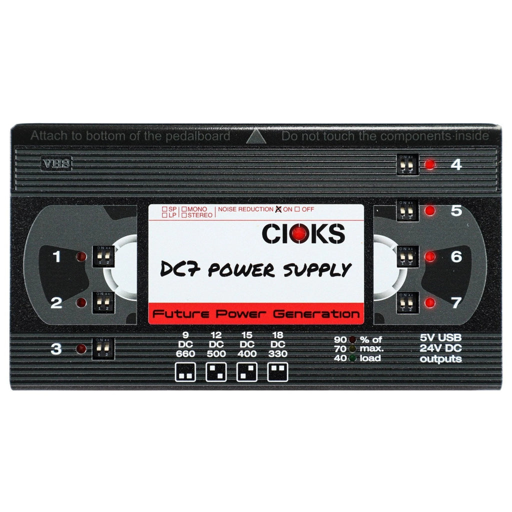 CIOKS DC7 features 7 isolated DC-outlets for effect pedals each with four selectable voltages. Each of the outlets can put out 6W which corresponds to 660mA of current at 9V. Additionally the DC7 has also a 5V USB outlet and an auxiliary 24V outlet. The DC7 is expandable with CIOKS 4 Expander, CIOKS 8 Expander and the Crux for more isolated outlets and even more flexibility. Combined with the large set of CIOKS Flex cables included we are confident in that this is the most flexible, noise-free solution in the market for powering pedalboards with a multitude of different pedals.