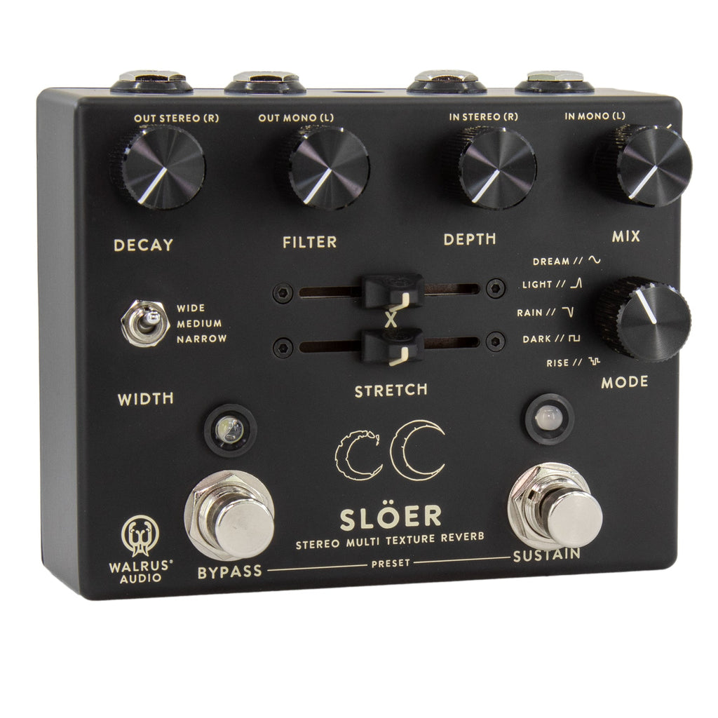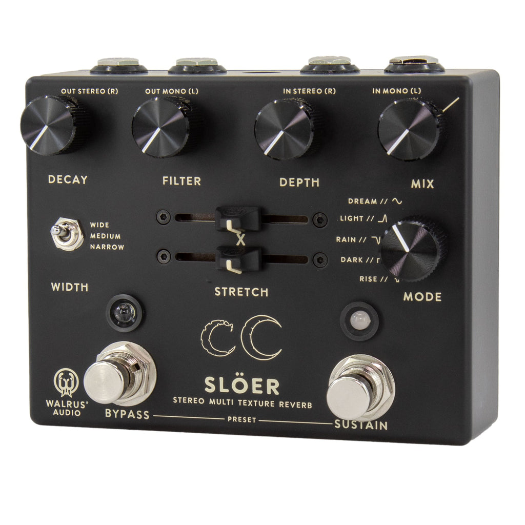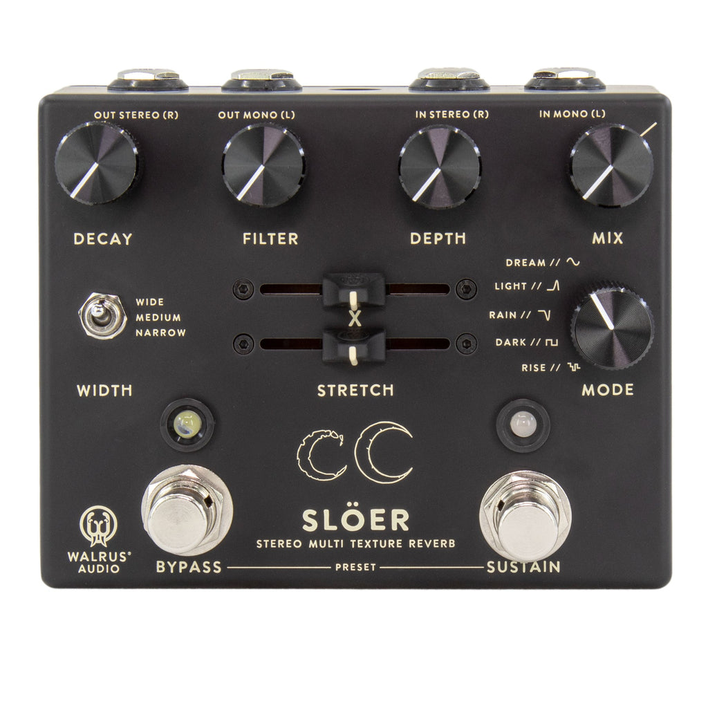 The Slöer Stereo Ambient Reverb builds on our popular Slö lineup but adds two additional reverb algorithms, stereo width control, two additional modulation wave shapes, and the ability to control the sample rate. Now you can create immersive, lush, modulated, sleepy, and ambient soundscapes with more width and depth than ever before. Save your favorite dreamscapes with three onboard presets by simultaneously pressing and holding down on the bypass and sustain switches. Scroll through them by simultaneously pressing and releasing bypass and sustain. The five-way rotary dial allows five different reverb modes - the three you know and love from the Slö: Dark (Lower Octave), Rise (Ambient Swell), and Dream (Latching Pad); and the addition of two new modes: Rain (Delay Tap Diffusion) and Light (High Octave Shimmer). Secondary functions on the dial change between five different wave shapes for modulation on the reverb trail. Combine deep modulation, long washy trails, and an immersive stereo field to experience Slöer.