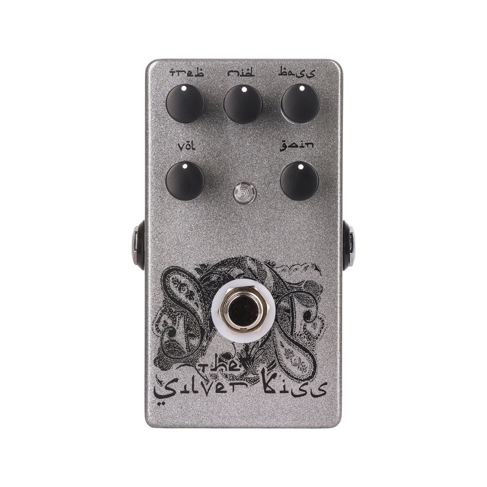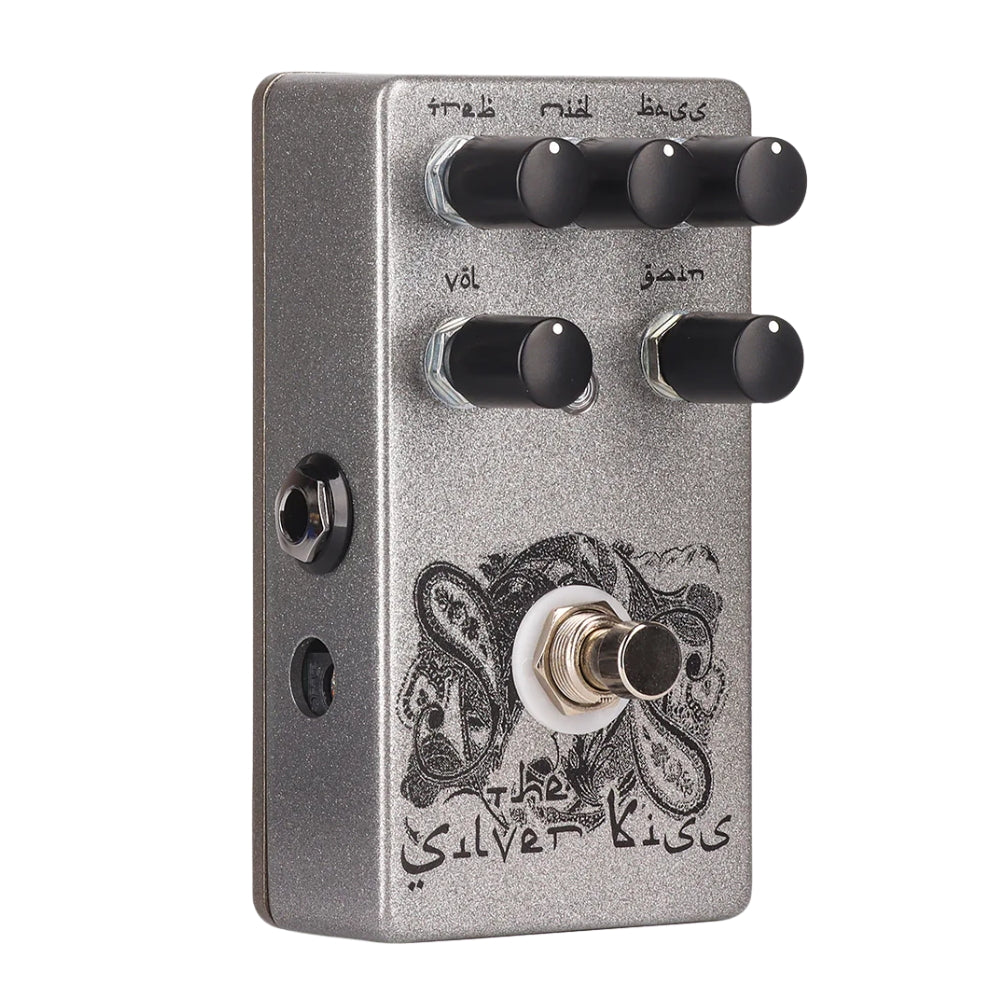 The Silver Kiss MK2 is engineered to give you three effects in one: clean boost, medium-gain OD and a powerful three-band EQ. After finding one tucked away in storage, we decided to give new players a crack at trying out our original flagship overdrive. Voiced to be a glassy drive with superior breakup and natural-sounding note decay, the Silver Kiss’s front end features a tastefully-voiced op-amp drive engine with just the right amount of gentle clipping to make harmonics really pop. Dialing back the gain control removes all semblance of crunch for a whistle-clean boost with a robust EQ section backing it. Setting each EQ band to noon also removes them from the circuit for a transparent boost-OD combo. The active EQ is an extremely powerful one with much more boost available on all three bands and some supreme interactivity to conjure up some real wool or some thinned-out tones that can be supplemented with another pedal further down the line.