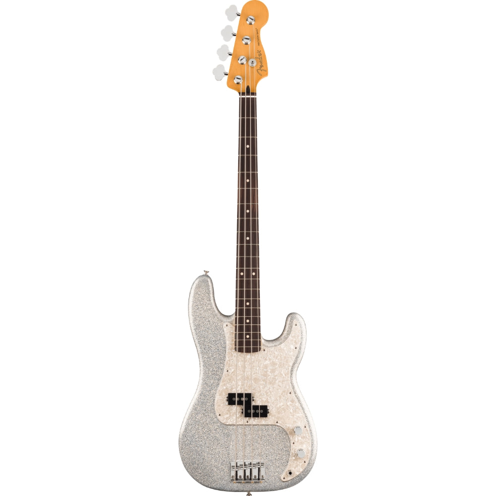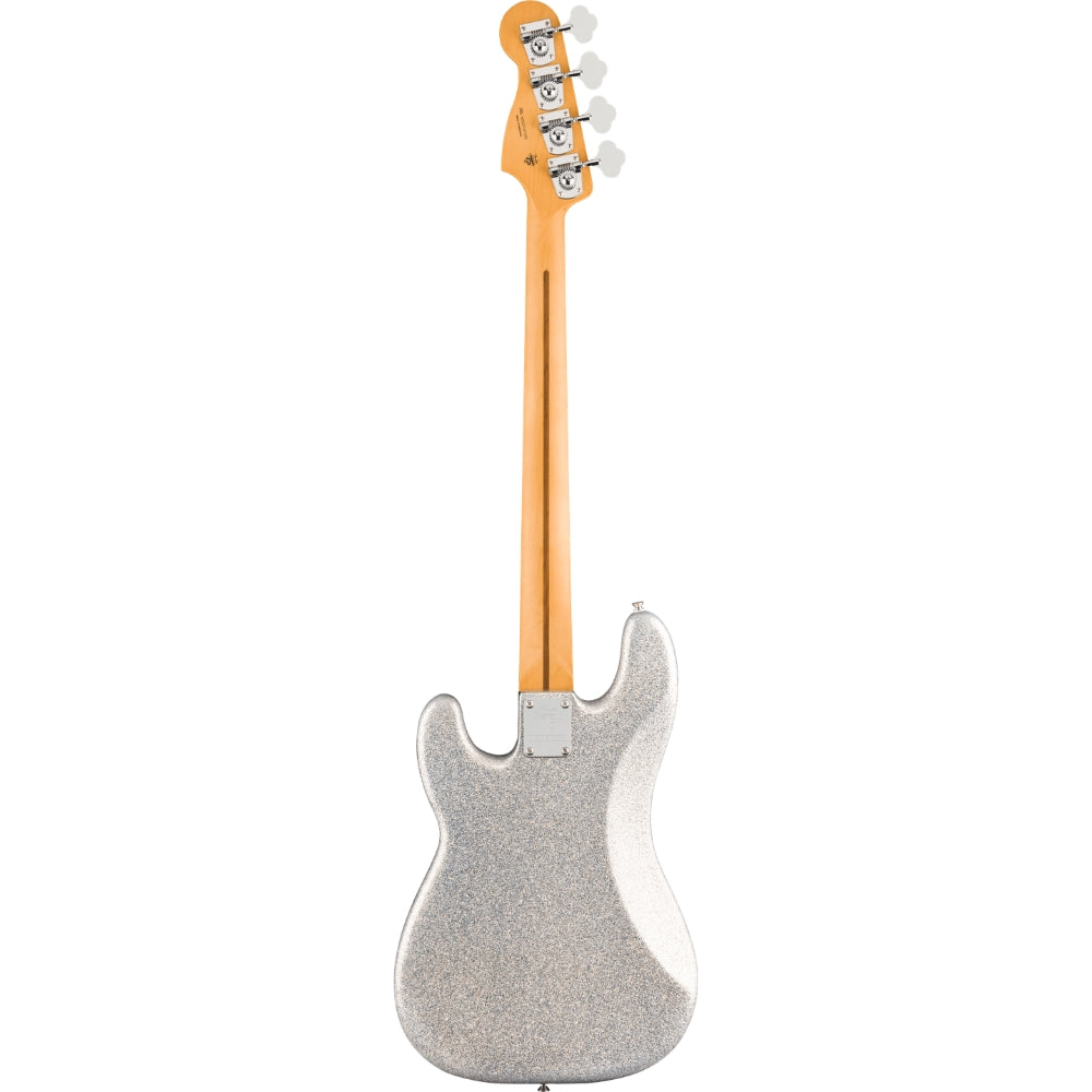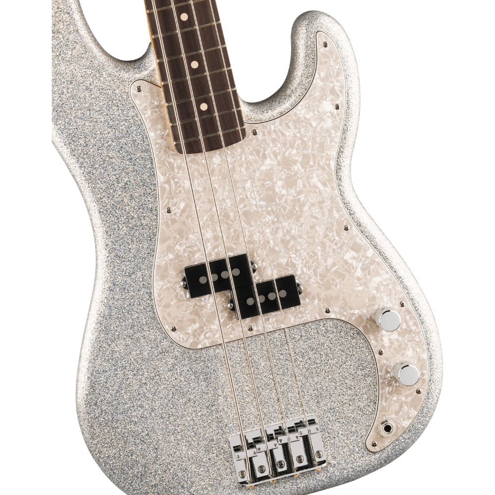 Experience modern craftsmanship with a touch of sparkle in the Player II Precision Bass. Crafted with a resonant alder body finished in eye-catching Diamond Dust Sparkle, this instrument delivers both style and substance. The Modern "C" shaped maple neck with 9.5" radius rosewood fingerboard, rolled edges, and medium jumbo frets provide the smooth, comfortable playability that today's players crave. The 75th Anniversary Thunderbolt™ Precision Bass pickup delivers rich, powerful tones with enhanced clarity and punch that cuts through any mix. Other quality appointments include a 4-Saddle Bridge with Single-Groove Steel “Barrel” Saddles, open-gear tuning machines and a 4-ply pearloid pickguard with chrome hardware throughout. This exceptional 75th Anniversary Player II Sparkle Precision Bass combines contemporary appointments with a premium sparkle finish, perfect for players who want to stand out while delivering that legendary P-Bass sound.