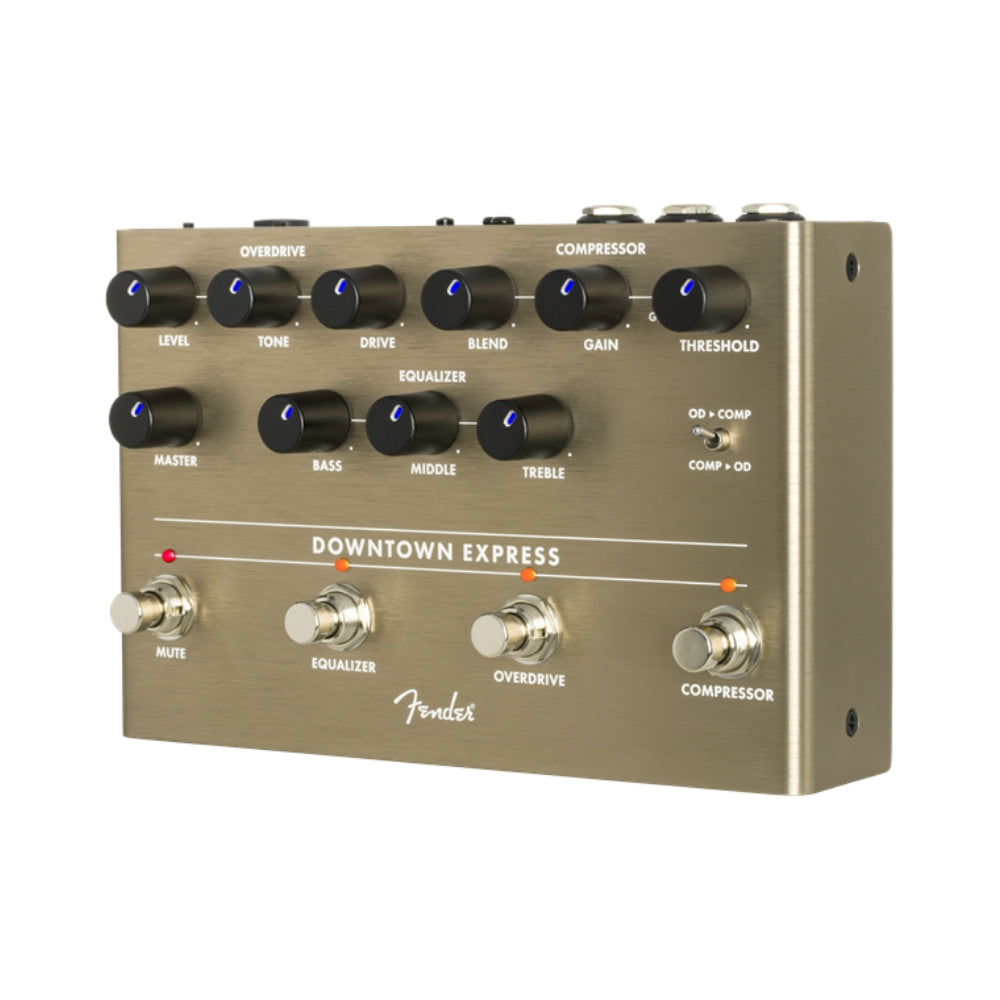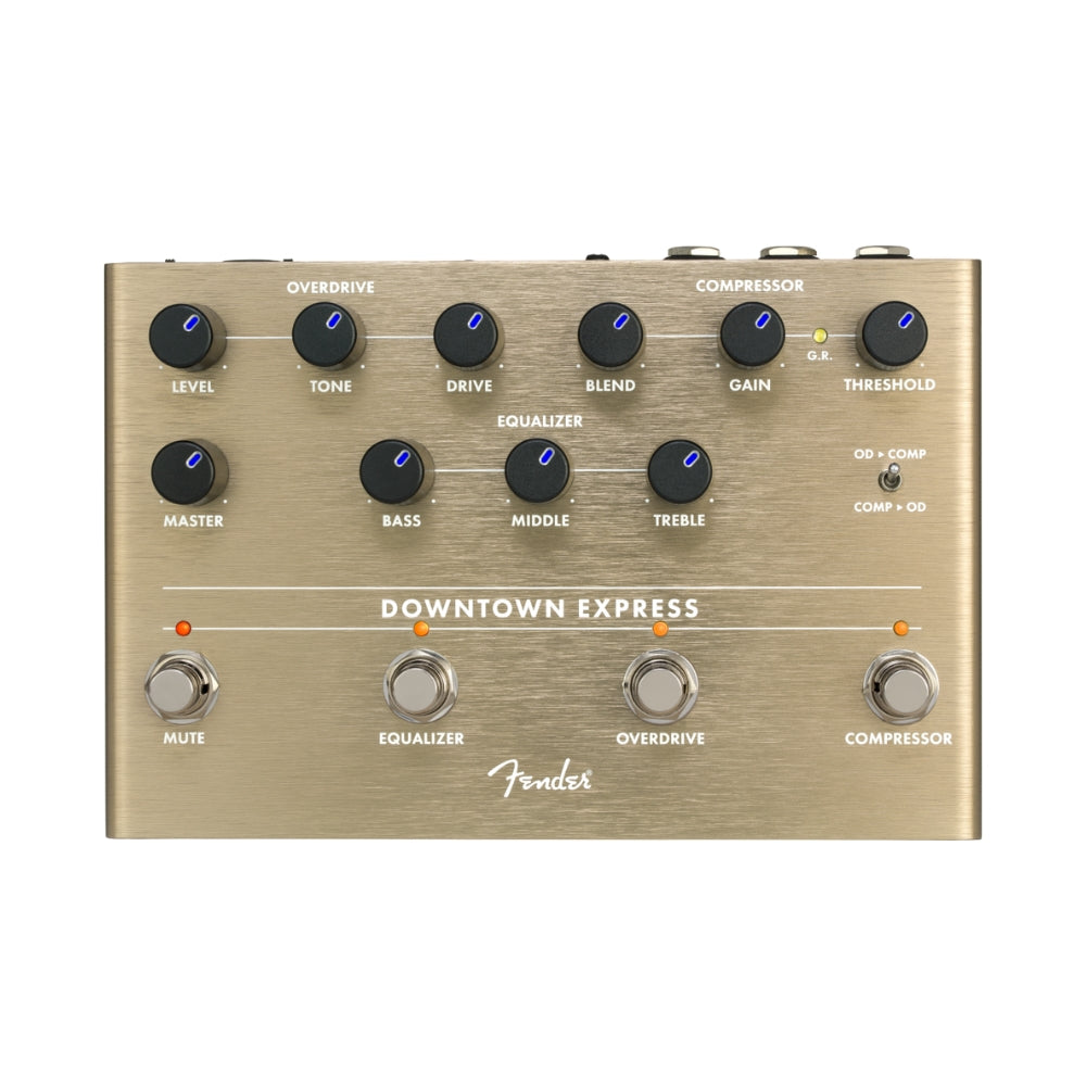 Your one-stop shop for bass tone-shaping, the Downtown Express bass multi-effect puts everything you need for killer bass tone right at your feet. All the bass essentials are there - compressor, 3-band EQ and overdrive - each switchable on its own, or you can use the Mute switch to kill the signal for silent tuning. The Direct Output makes it easy to integrate this pedal into any performance situation - stage or studio. We recognize that a truly powerful signal chain needs to be flexible, so we included a switch that lets you reorder the compressor and overdrive circuits to taste. Designed by Alex Aguilar, the Downtown Express is an all-original Fender circuit. To ensure this pedal is performance-ready we let musicians kick it around, took their feedback to heart and refined it. The chassis is crafted from lightweight, durable anodized aluminum, and the LED-backlit knobs show your control settings on a dark stage at a glance. Use the Downtown Express on your next gig or session and add some rumble to your rig.