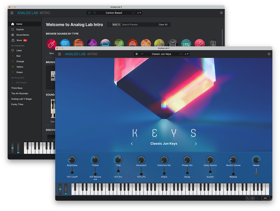 Analog Lab Intro features a streamlined interface that puts essential parameters front and center. Quickly browse sounds by type, tweak them with smart macro controls, and find your perfect tone without diving deep into complex synthesis.