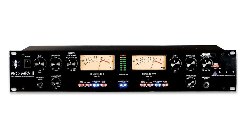 The ProMPA II can operate at either a low or high plate voltage on the two integrated hand-selected 12AX7 tubes for wider variation of preamp tone and performance. Large back-lit analog VU output meters display output levels while multi-colored LED arrays show tube gain.