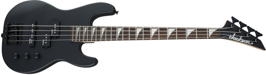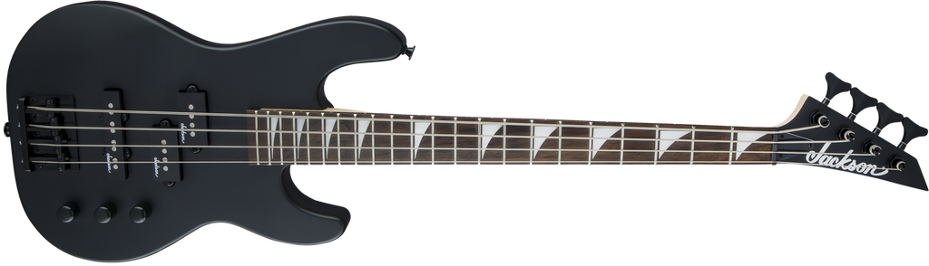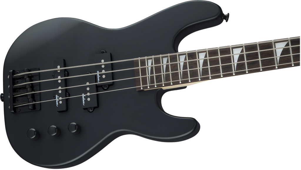 A Jackson P style neck pickup and Jackson J style bridge pickup power this 4-string bass, which also features a pair of volume knobs, single tone knob, hardtail bridge with black base plate and Jackson-branded tuners.